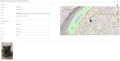 Klickt man in der Listenansicht auf den Zeitstempel, öffnet sich die Detailansicht der Meldung. In dieser Ansicht sieht man auf der Karte einen blauen Pin, der die Geokoordinaten des Ortes zeigt, an dem die Meldung abgesetzt wurde. Der schwarze Pin markiert die Koordinaten der zugehörigen Adresse. Die angezeigten Felder entsprechen jenen der Listenansicht. In der Detailansicht können die Felder bearbeitet und das hinterlegte Foto geöffnet bzw. angesehen werden.