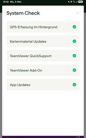 Beim Starten der awm app wird nun automatisch ein Systemcheck durchgeführt. Dabei wird überprüft, ob alle erforderlichen Berechtigungen korrekt erteilt wurden, ob die Navigationskarte heruntergeladen und auf dem neuesten Stand ist, und ob der TeamViewer Quick Support inklusive aller benötigten Add-ons installiert wurde.