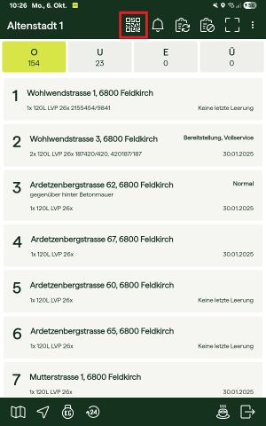 Ab sofort können Leerungen am Tablet nicht nur manuell („Leerung erfassen“) oder über ein angebundenes Identsystem durchgeführt werden. Neu ist die Möglichkeit, eine Leerung einfach durch das Scannen eines QR-Codes am jeweiligen Behälter zu erfassen.