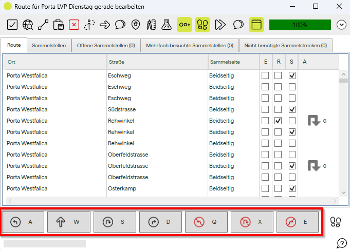 Mit dem Aktivieren der verschiedenen Kontrollkästchen kann für jeden Routenabschnitt festgelegt werden, ob dieser als Einbahn (E), als rückwärts fahren (R) oder als zu sammelnder Routenabschnitt (S) berücksichtigt werden soll. Wird ein Routenabschnitt als rückwärts markiert, bei welchem im Streckennetz bereits die Gegenfahrbahn als 'rückwärts bevorzugt' markiert wurde, erhält man eine Hinweismeldung.